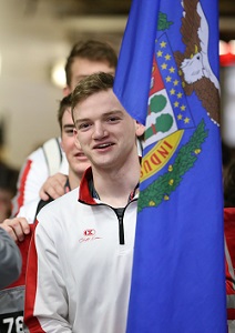 PHOTOS: (Top) Temperance Bedford’s Connor Bartlett leads his team into the Wings Event Center arena before the Division 1 Team Quarterfinals on Feb. 28. (Middle) Bartlett prepares to carry the City of Kalamazoo flag during the procession. (Click for more from HighSchoolSportsScene.com.)