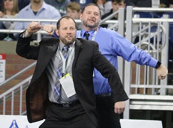 PHOTOS: (Top) Croswell-Lexington’s Chris Lilly has his hand raised in victory during last season’s MHSAA Division 2 Individual Finals at Ford Field. (Middle) Lilly’s father and coach, Joe (front), celebrates his son’s win. (Click for more from HighSchoolSportsScene.com.)