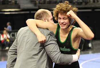 PHOTO: (Top) Mendon's Skyler Crespo wrestles Erie Mason's Robert LeFevre during Saturday's Division 4 Final at 125 pounds. (Middle) Crespo celebrates his first MHSAA championship. (Click for more from HighSchoolSportsScene.com.)