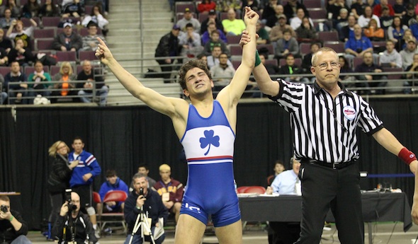 PHOTO: Detroit Catholic Central's Malik Amine has his hand raised in victory during the Division 1 Individual Finals. (Click to see more fromHigh School Sports Scene.)