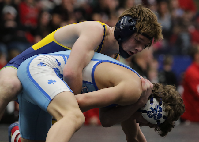 PHOTOS (Top) DCC’s Benny Eziuka, top, locks up with Hartland’s Jacob Pretzel at 285 pounds in Saturday’s Division 1 Final. (Middle) Hartland’s Dallas Korponic, top, wrestles DCC’s Michael Cannon at 138 pounds. (Click for more from High School Sports Scene.)