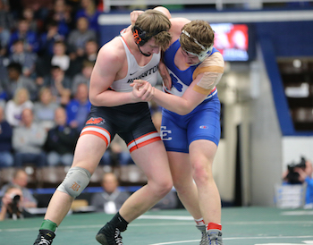 PHOTOS: (Top) Detroit Catholic Central’s Dominick Lomazzo celebrates his win at 125 pounds. (Middle) Brighton’s Luke Stanton and DCC’s Easton Turner lock up at 215 pounds. (Click for more from HighSchoolSportsScene.com.)