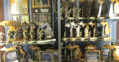 PHOTOS: (Top) Sean Sterling's hand is raised after his victory for Dundee during last season's MHSAA Team Final against Remus Chippewa Hills. (Middle) Dundee coach Tim Roberts celebrates during the championship match win at Central Michigan University. (Below) The Dundee trophy case is full of hardware celebrating the wrestling program's succcess. (Click to see more action photos from HighSchoolSportsScene.com; trophy and wall photos by Chip Mundy.)