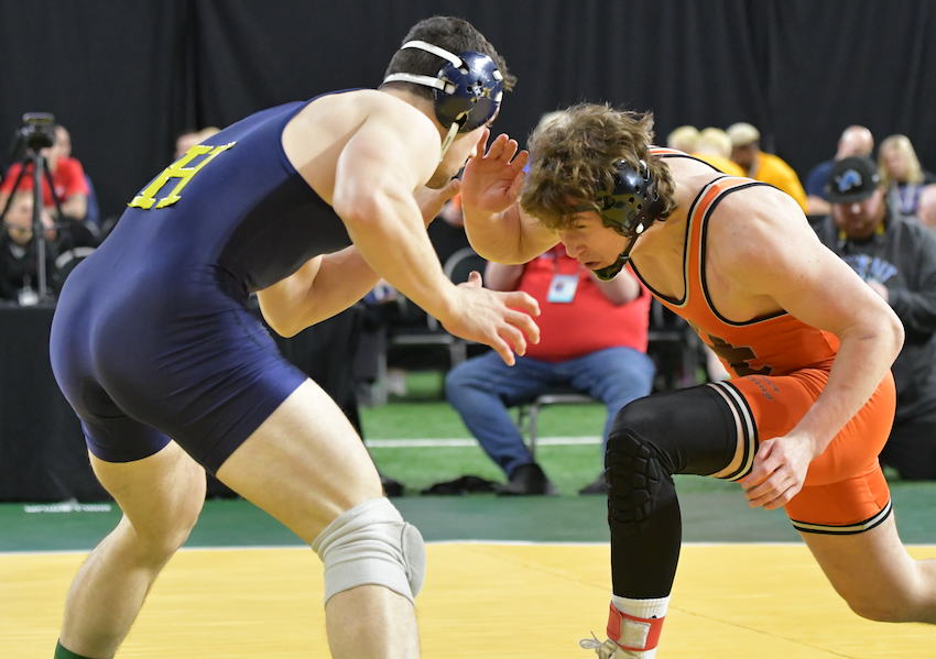PHOTOS (Top) Kade Kluce’s arm is raised in victory after clinching his fourth Individual Finals championship Saturday. (Middle) Alma’s Cole O’Boyle, right, works for an opening against Hillsdale’s Stephen Petersen. (Click for more from High School Sports Scene.)