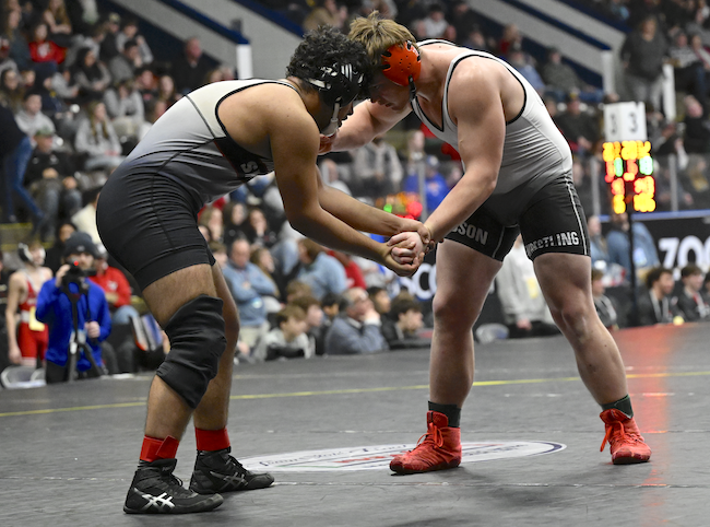 PHOTOS (Top) Hudson’s Barron Mansfield celebrates his pin at 190 pounds during Saturday’s Division 4 Final. (Middle) St. Louis’ Ramon Anguiano, left, and Hudson’s Cameron Miller lock up at 215 pounds. (Click for more from High School Sports Scene.)