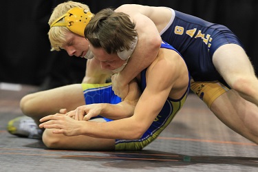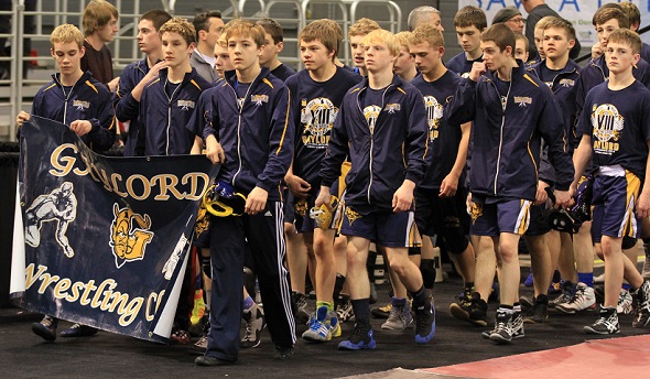 PHOTOS: (Top) Gaylord’s wrestling team takes part in the pre-match march before last season’s Division 2 Quarterfinals at Kellogg Arena. (Middle) Jon Martin (top) wraps up Dakotah Leland of Flint Kearsley during their match at 130 pounds. (Below) Coach Jerry LaJoie is in his 22nd season leading the program. (Click for more photos from HighSchoolSportsScene.com.)