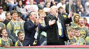 PHOTOS: (Top) Gaylord’s Cade Foster works toward a pin during last season’s Division 2 Semifinal win over Warren Woods Tower at Wings Stadium. (Middle) The Blue Devils, including coach Jerry Lajoie (left), cheer on a teammate. (Click to see more from HighSchoolSportsScene.com.)