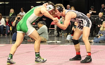 PHOTOS: (Top) Manistique's Tanner Gonzalez celebrates his MHSAA Division 4 title Saturday at The Palace of Auburn Hills. (Middle) Gonzalez (left) locks up with championship match opponent Johnathon Stid of Dansville. (Click to see more from HighSchoolSportsScene.com.)