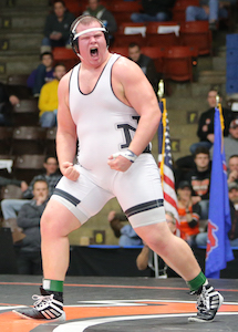 PHOTOS: (Top) Hudson’s Scott Torres works toward a major decision during Saturday’s championship match. (Middle) New Lothrop’s Cameron Dusenberry celebrates his win at 285. (Click for more from HighSchoolSportsScene.com.)