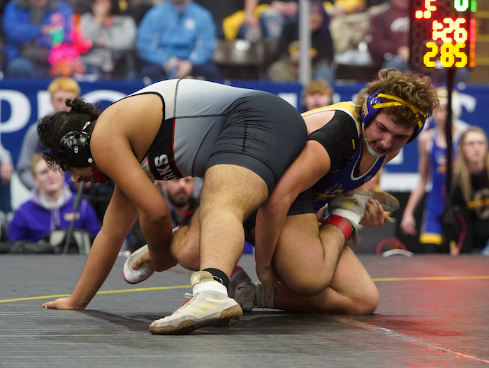 PHOTOS (Top) Hudson’s Nicholas Sorrow works toward a pin in his 113-pound match during the Division 4 Final. (Middle) Bronson’s Matthew Blankenship, right, and St. Louis’ Ramon Anguiano lock up at 285 in a Semifinal. (Click for more from High School Sports Scene.)