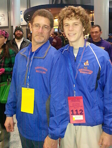 PHOTOS: (Top) "Little Mike" Higley, in blue, wraps up an opponent. (Middle) Edwardsburg coach "Middle" Mike Higley and his son "Little" Mike have been their family's second and third generation of MHSAA Finals qualifiers. (Below) "Little Mike" Higley, top, is 15-1 this season. (Photos courtesy of the Higley family.)
