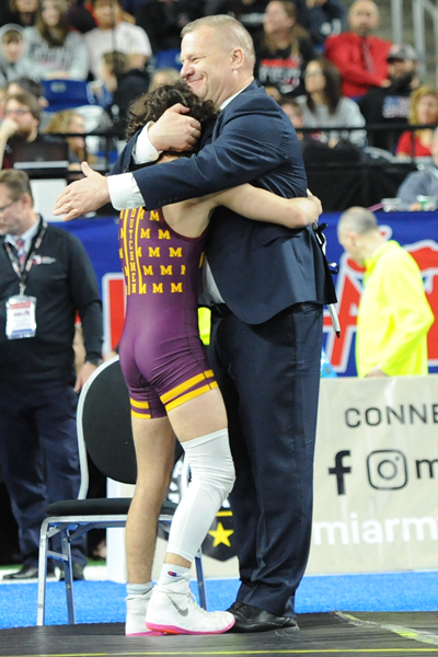 PHOTOS (Top) Sammy Stewart’s hand is raised by the official in victory after the Manchester standout won his championship match at the Individual Finals in March. (Middle) Teammate Blake Sloan, right, considers his next move during his championship match last season. (Below) Coach Steve Vlcek embraces Stewart after the victory. (Click for more from High School Sports Scene.)