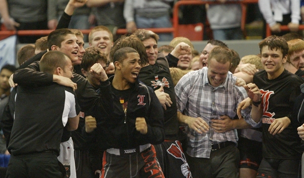 PHOTOS: (Top) Lowell wrestlers celebrate their first MHSAA team championship since 2009. (Middle) A Lowell wrestler focuses on his St. Johns opponent during Saturday’s match. (Click to see more at HighSchoolSportsScene.com.)
