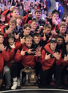 PHOTOS: (Top) Lowell and Gaylord wrestlers work for control at the start of a match during Saturday’s Division 2 Final. (Middle) The Red Arrows celebrate their seventh-straight Division 2 championship. (Click for more from HighSchoolSportsScene.com.)