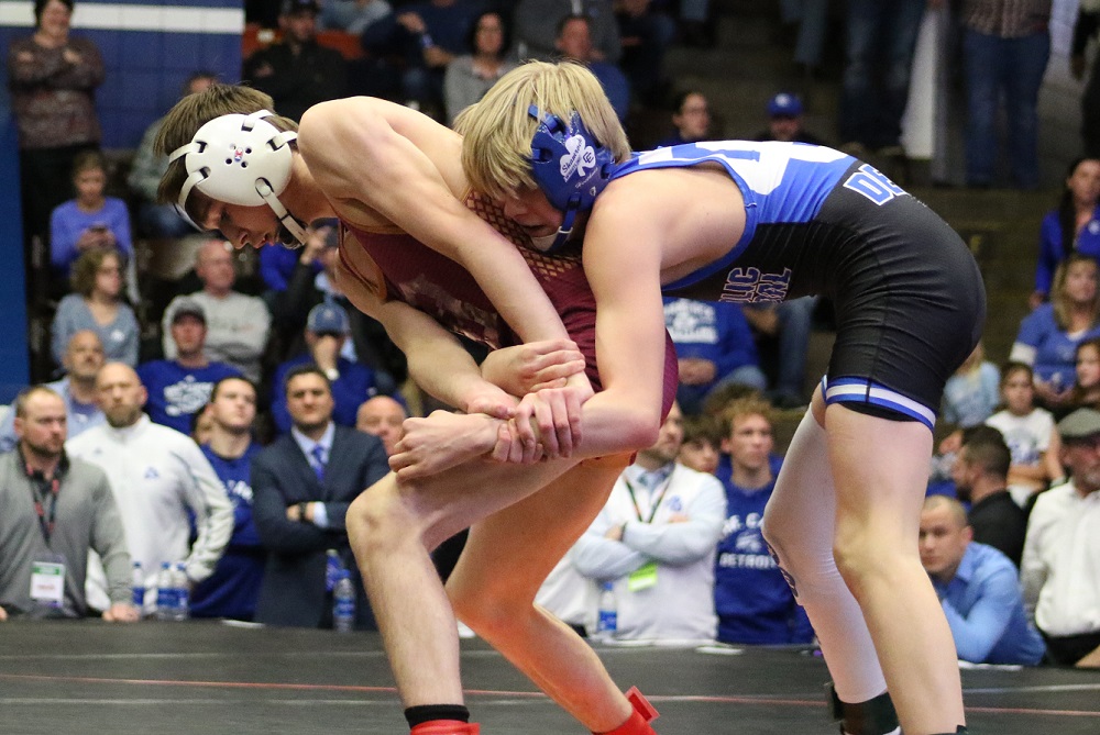 PHOTO: Davison’s Aden Williams, left, and Detroit Catholic Central’s Drew Heethuis wrestle during last season’s Division 1 Final at Wings Event Center. (Click for more from HighSchoolSportsScene.com.)