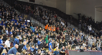 PHOTOS: (Top) Wrestlers stand for the national anthem before Friday's Division 1 matches. (Middle) The stands are nearly filled as wrestlers compete in Quarterfinals. (Photos by Michelle Campbell.)