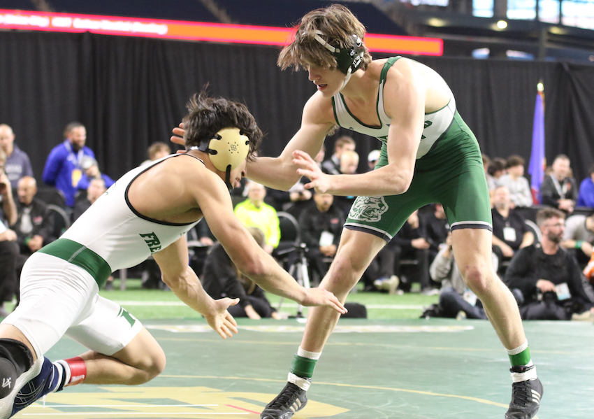 PHOTOS (top) Gaylord’s Zane Willobee, left, and Clio’s D’Marion Erlenbeck ready for the restart of their match at 157 pounds Saturday. (Middle) Wayland’s Lane Button, right, works against Freeland’s Fabian Facundo in the 150-pound title match. (Click for more from High School Sports Scene.)