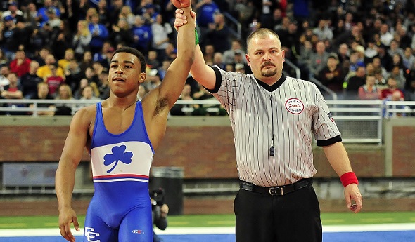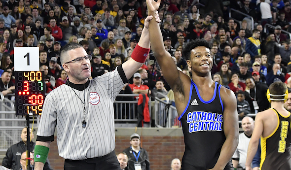 Detroit Catholic Central’s Dylan Gilcher wrestlers during his team’s Division 1 championship match last weekend at Wings Event Center.