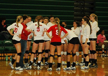 St. Philip finishes the first match of pool play with a 25-12, 25-17 win over Harper Creek. It’s a good sign for a few reasons – Harper Creek is a solid program coming off a District title in 2010, and Groat has to run a home football game kicking off in nine hours. It’s “Parents Night” for the football players, and she’s banking on volleyball being done by 4 p.m. in case she needs to make a pick-up at the florist on the way to setting up.