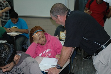 Senior Math students at Everett are checking their first grades of the fall and working on graphs while Hartley makes the rounds assisting students and answering questions.