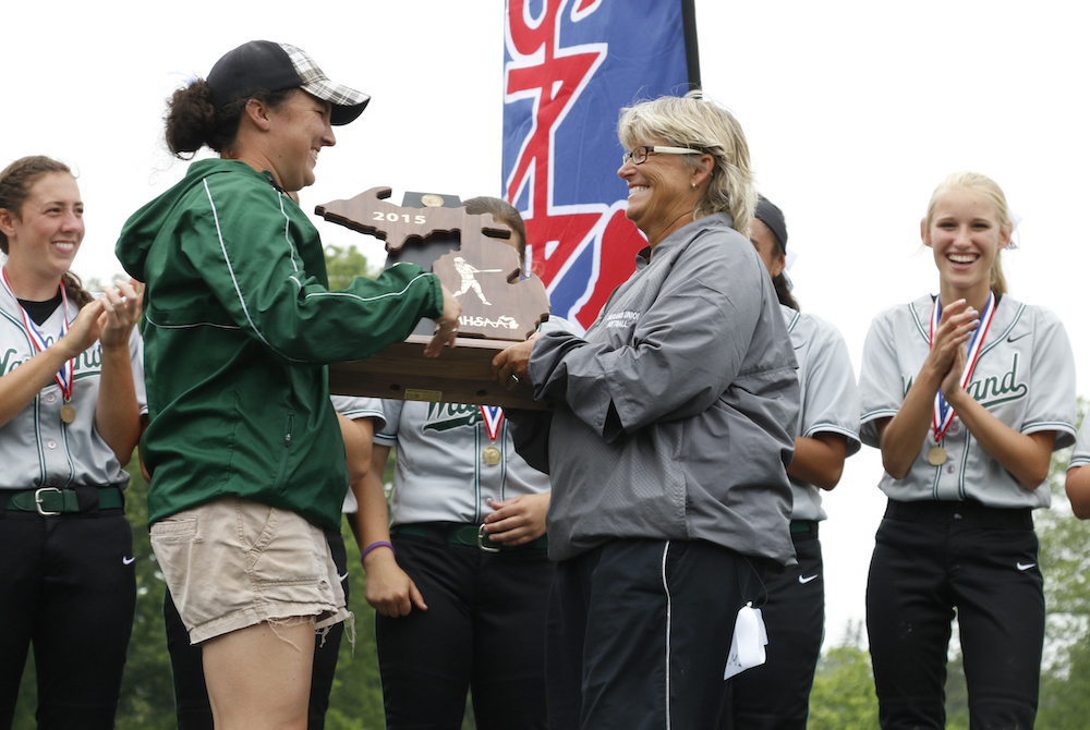 PHOTO: Wayland softball coach Cheri Ritz, front right, accepts the Division 2 championship trophy in 2015.