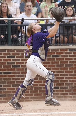 PHOTOS: (Top) Bronson volleyball players celebrate clinching the Class C championship at Kellogg Arena in the fall. (Middle) Then-freshman catcher Payton Robinson prepares to catch a pop fly during last season's Softball Finals weekend at Secchia Stadium.
