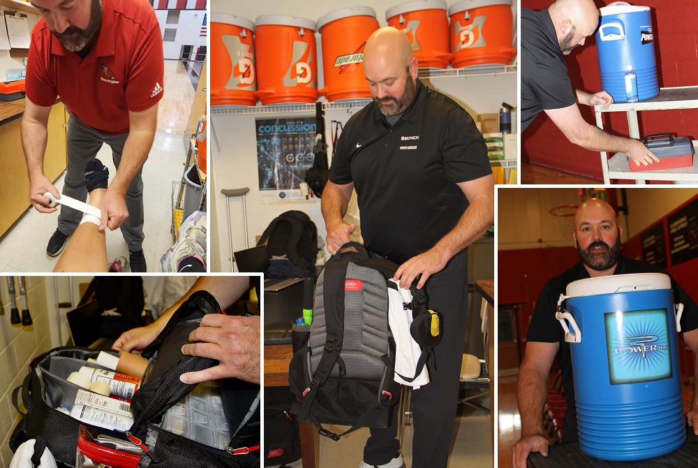 PHOTOS (Top) Bloomingdale trainer Scott Allison has several tasks as he works to keep the school’s student-athletes healthy and pain-free. (Middle) Bloomingdale athletic director Jason Hayes, left, and assistant varsity football coach Lance Flynn. (Below) Allison packs his bag for another full afternoon. (Ankle-taping photo by Andreya Robinson; all other photos by Pam Shebest.)