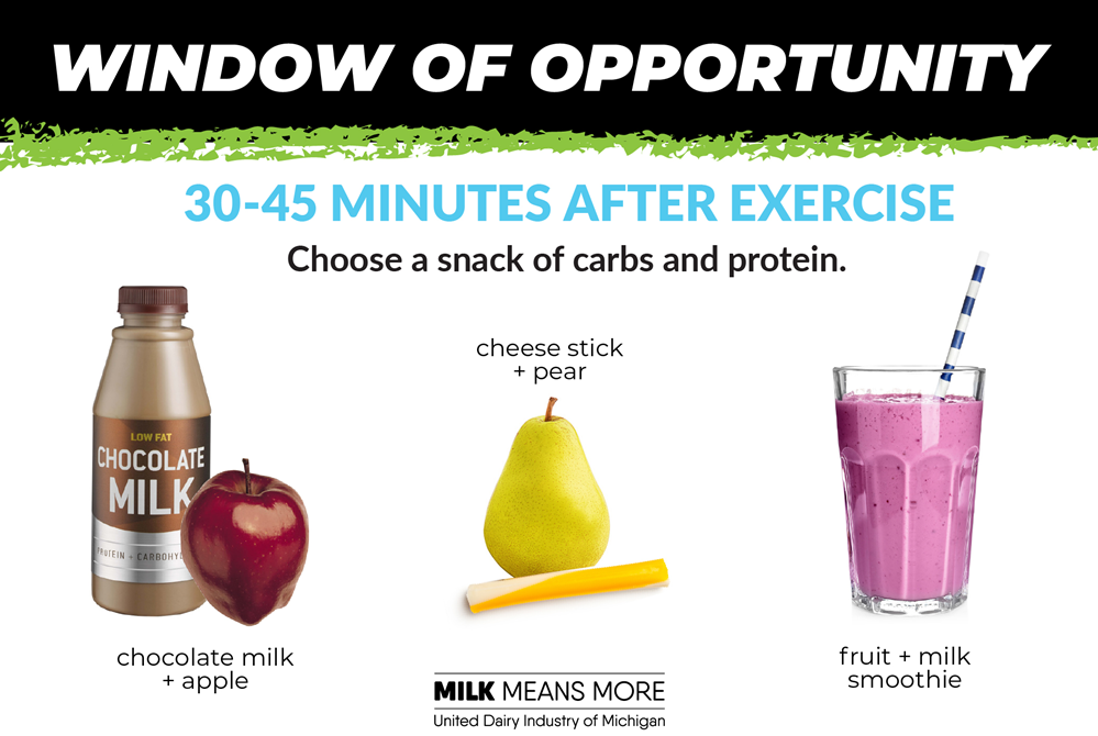After an exercise session or game, muscles are depleted of glycogen, their primary energy source, and are in need of recovery from the stress of training. A small snack is all that is needed in this “window of opportunity.”