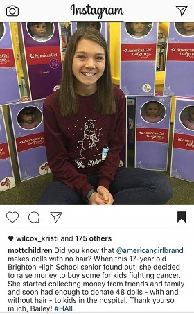 PHOTO: (Top) Brighton’s Bailey Brown stands with some of her donation of toys to the C.S. Mott Children’s Hospital this past winter. (Middle) Brown is recognized by Mott on its Instagram feed. (Photos courtesy of Bailey Brown.)