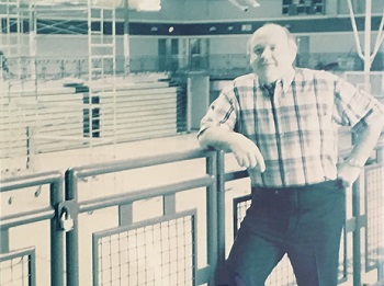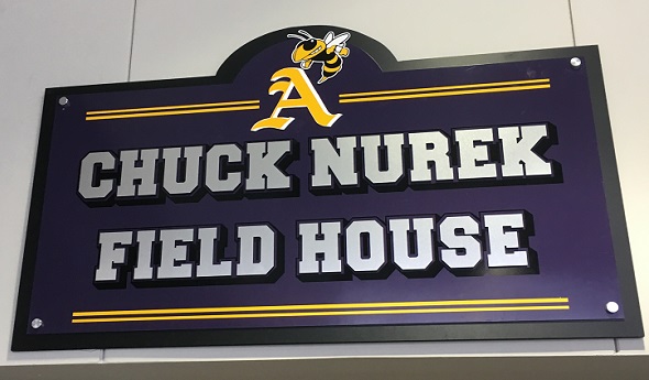 PHOTOS: (Top) A sign over the doors at Auburn Hills Avondale's gym announces the former athletic director for which it is named. (Middle) Chuck Nurek stands for a photo inside the building named after him. (Photos courtesy of Avondale High School.)