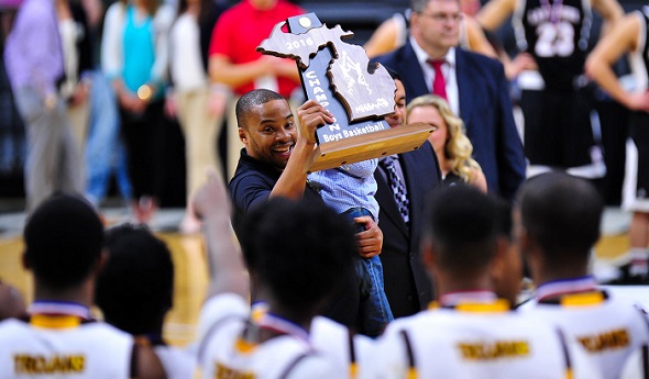 PHOTO: Detroit Henry Ford boys basketball coach Kenneth Flowers hoists his team's Class B championship trophy this winter.