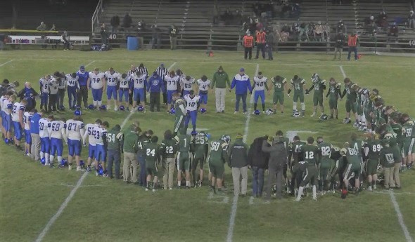 Sand Creek and Pittsford were in the middle of their playoff game on Ernie Ayers Field at Sand Creek when Hoffman collapsed. Gallagher and Pittsford head coach Mike Burger met and decided to circle the players up. The photo has been widely circulated on social media the last couple of days.