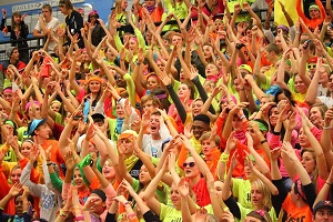 Eagle Nation plans a theme for every home game, and Friday was all about neon. More than 400 students packed the sections behind the north basket, glowing in all hues of neon covering T-shirts, tank tops, pants, socks and head bands. Those six leaders each wore a hot pink tank top, with one letter painted on each spelling E-A-G-L-E-S. With help of the administration, the leaders even sold bright $1 bandannas to everyone in the student section to top off the neon look. Even the basketball team got into the act: Players surprised their classmates by wearing neon-green ankle tape and those same neon bandannas during warm-ups.