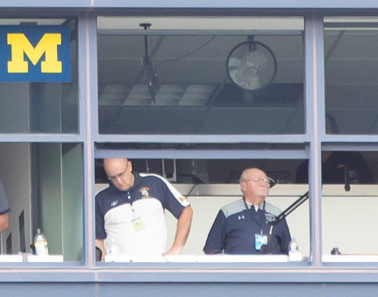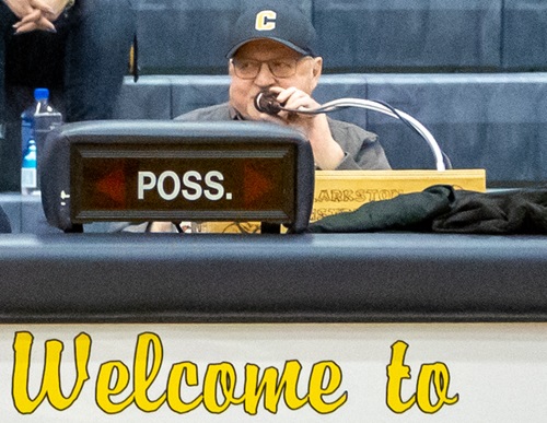 PHOTOS (Top) Neil Granlund, speaking into the microphone, announces during a Clarkston home basketball game. (Middle) Granlund, right, takes his place in the Michigan Stadium press box in advance of announcing Clarkston’s “Battle at the Big House” football game. (Below) Granlund narrates the action during another event at the school. (Photos by Larry Wright.)